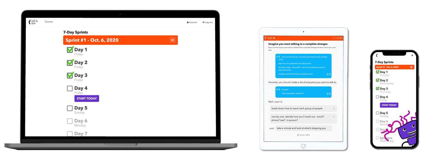 In essence, 7-Day Sprint packages up a bunch of different proven techniques for overcoming intertia and the cognitive biases we all face, into a simple press-and-go course.