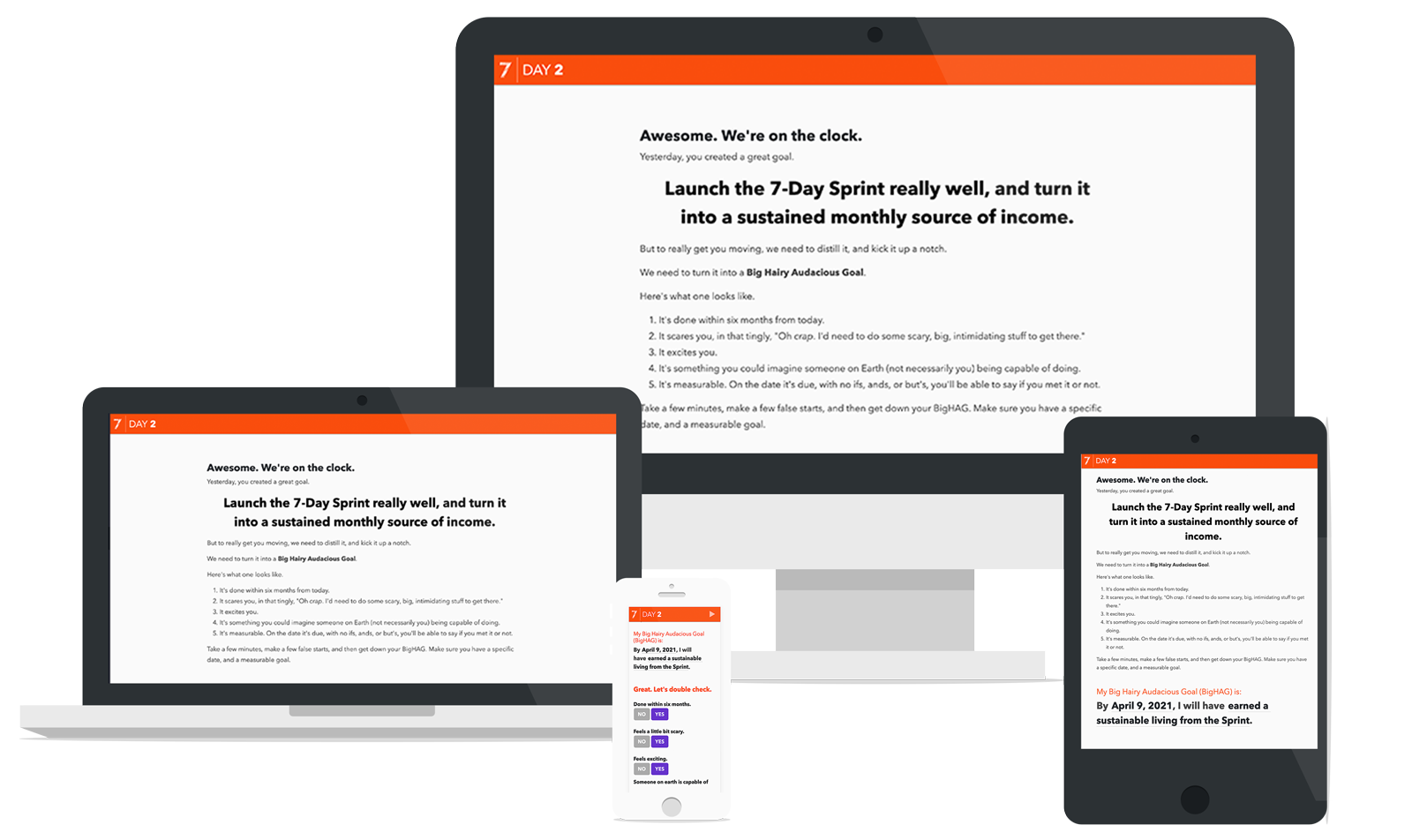 In essence, 7-Day Sprint packages up a bunch of different proven techniques for overcoming intertia and the cognitive biases we all face, into a simple press-and-go course.